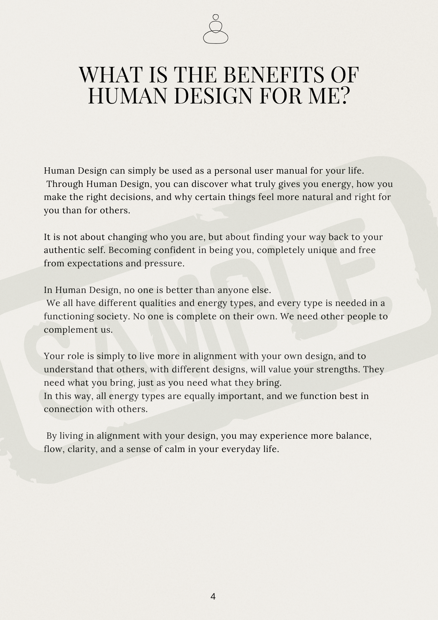 You will receive a detailed written report (approx. 80–100 pages) that explains how your energy works, how you make decisions, and how to live more in alignment with yourself.